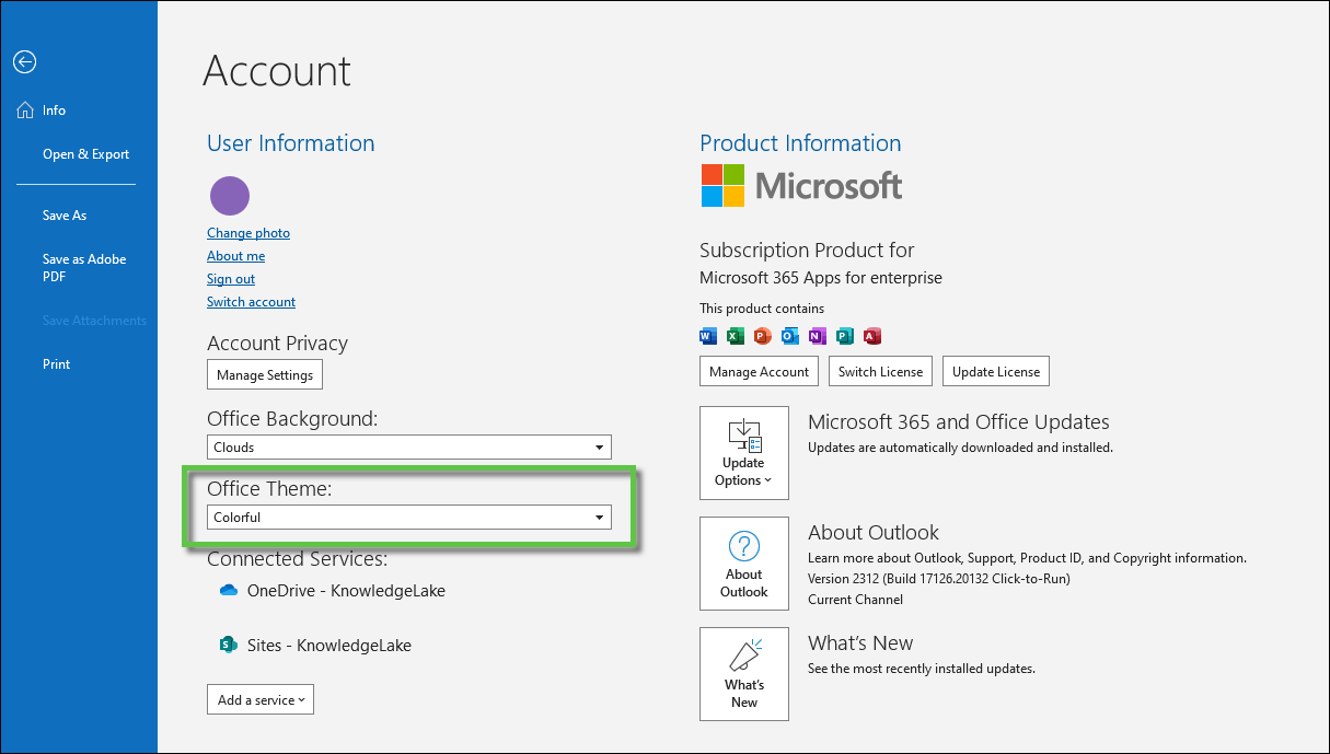 - On this page, there is a drop-down labaled Office Theme. Change it to another theme besides Dark Gray (Colorful is the default).